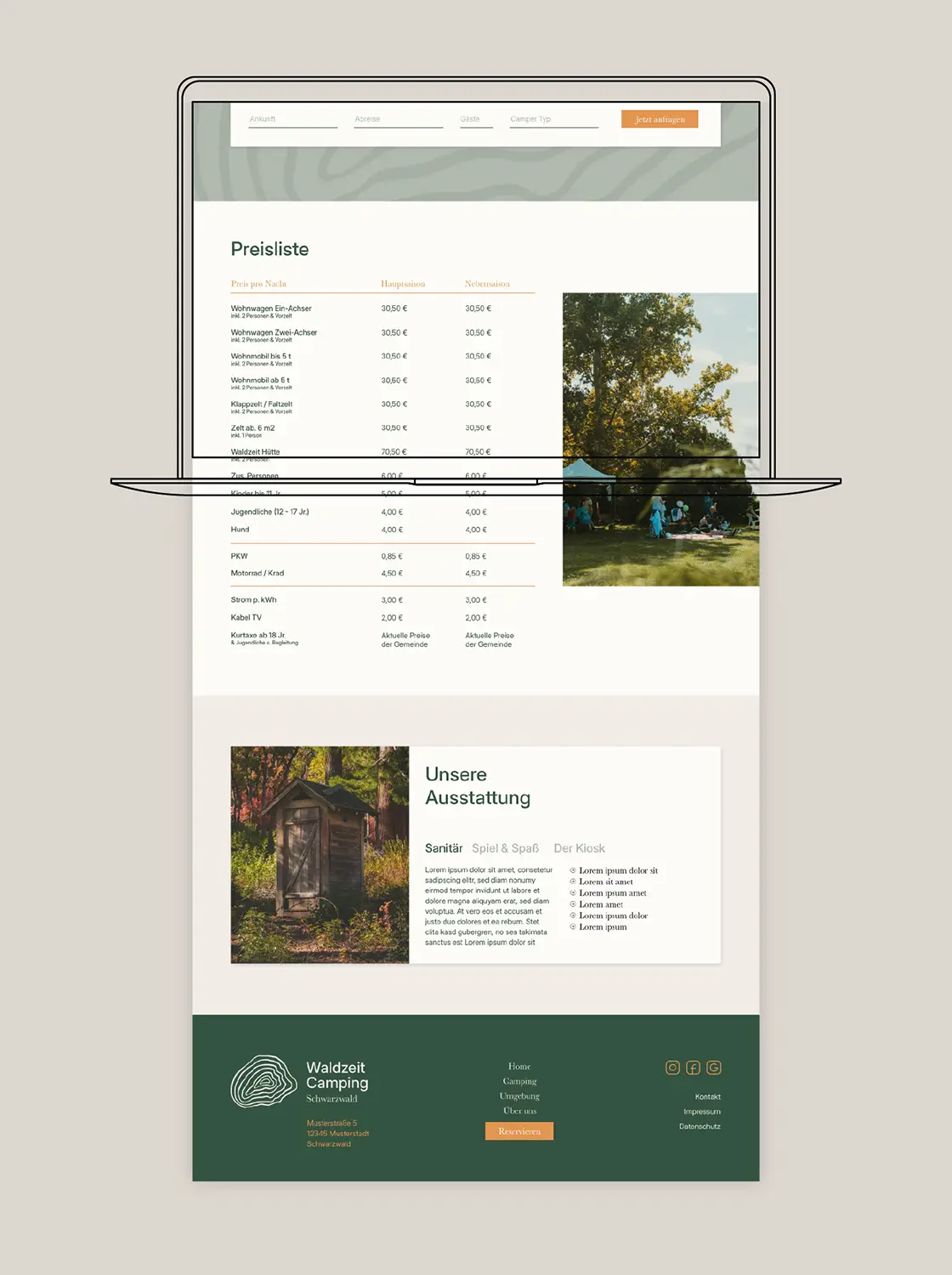 Optisch spiegelt sich die Ästhetik des Logos, naturverbunden und modern, auch im Website Design wider. Die Mischung aus moderner und traditioneller Schrift schafft somit eine schöne Balance der Werte des Campingplatzes, ohne gezwungen zu wirken.